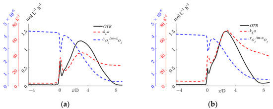 Axial profiles of OTR, kLa, and interphase mass transfer driving force, yO2/m-xO2, for the operative conditions considered: (a) QL = 25 m3/h and QG = 3.75 L/min; (b) QL = 30 m3/h and QG = 7.5 L/min. The initial and final part of the pipe are omitted to improve readability.