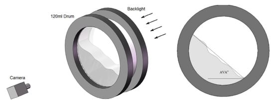 Avalanche angle (AVA) was measured by a powder analyzer (Revolution Powder Analyzer, Mercury Scientific Inc.,  Newtown, CT, USA). For the AVA test, a tapped volume of 120 mL of powder was placed into a 11 cm diameter, 3.5 cm wide cylindrical drum, a standard accessory of the Revolution Powder Analyzer. Then, the drum with powder inside was set to rotate at various rotation speeds by two high-precision silicone rollers controlled by a step motor. The behavior of the powder inside the drum whose rotation speed was set at 0.6 rpm was recorded by a digital camera with the assistance of backlight illumination. During the rotation process, 200 avalanches occurred in the drum and average AVA was obtained by a computer with manufacture supplied software. The schematic of AVA measurement is shown in Figure 4.