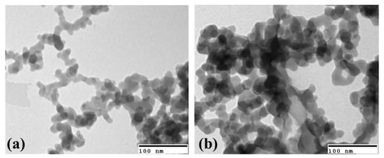 The particle sizes and structures of additive before and after encapsulation with the 15 wt% polyester are characterized by TEM under 130 k magnification in Figure 5. Figure 5a shows the “tree structure” of the commercial nano silica before encapsulation, while Figure 5b shows that the “tree structure” is still remained after encapsulation and the additive particle size is increased but still in nano scale. The existence of the “tree structure”, which is considered to be the functional structure as flow conditioner [], indicates that the encapsulated additives still have the function as flow conditioners.