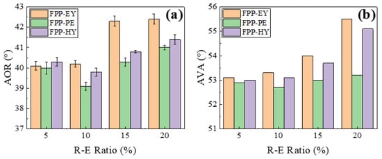Effects of R-E ratio on AOR and AVA. (a, d) FPP-EY; (b, e) FPP-PE; (c, f) FPP-HY.