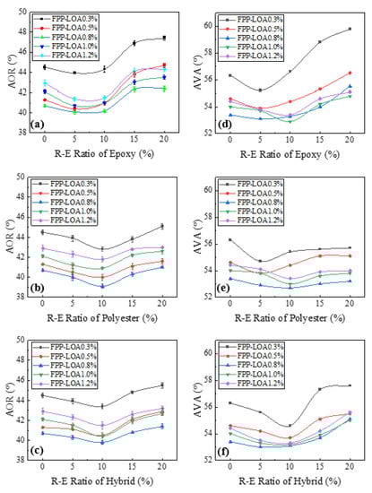 Figure 7 shows the effect of the resin-to-encapsulating material (R-E) ratio on the AOR and AVA under the specific additive loading ratio. As shown in Figure 7a, all the sample groups have similar trends with various LOAs: AOR decreases with the increase of the R-E ratio of epoxy to a minimum value when the epoxy R-E ratio is approximately 5~10% range. After that, with the increase of the R-E ratio of epoxy (10~20%), AOR increases gradually. There exists a minimum AOR at approximately 10% R-E ratio of epoxy. The similar trends can also be observed for different R-E ratios of polyester and hybrid, as shown in Figure 7b,c. AOR decreases with increasing R-E ratio of encapsulating material from 0% to 10% and then increases after this R-E ratio. The only difference between Figure 7a and the other two graphs is the decreasing rate of AOR with epoxy resin is slightly lower than that with the other two materials, when the R-E ratio is lower than 10%.