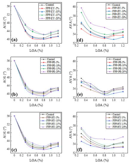Effects of LOA on AOR and AVA. (a, d) FPP-EY; (b, e) FPP-PE; (c, f) FPP-HY.