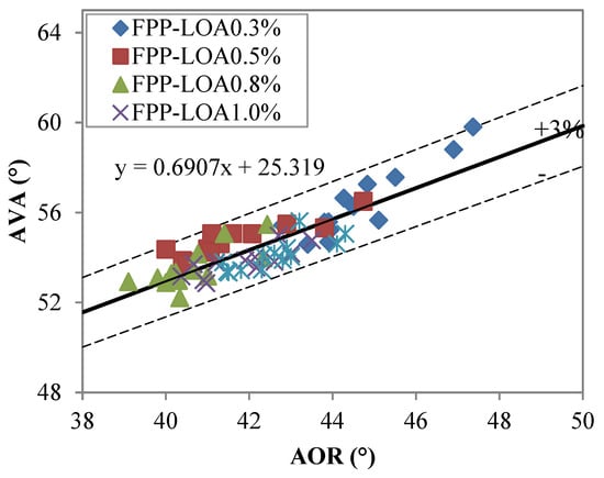 The relationship of the avalanche angle (AVA) and angle of repose (AOR) is shown in Figure 9 for different LOA, different encapsulating materials and various R-E ratios. There is a linear correlation between these two parameters, indicating that AVA can be represented by AOR and vice versa. By fitting all the data points, the mathematical expression of this linear correlation could be obtained. The error of this correlation is only ±3%. No discontinuity is observed for all the loading ratios of the additive groups.