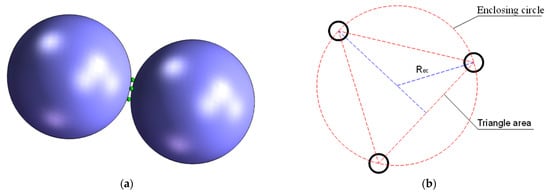 Guest particles, whose particle size is much smaller than that of host particles, can be introduced to increase the distance of two host particles (H0), therefore reducing the van der Waals force. A 3D model, three guest particles (distributed on the vertices of an equilateral triangle) forming the gap between the two host particles stably [], was established, as shown in Figure 11.