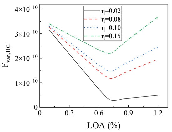 Van der Waals force vs. LOA under various effective surface area coefficient.
