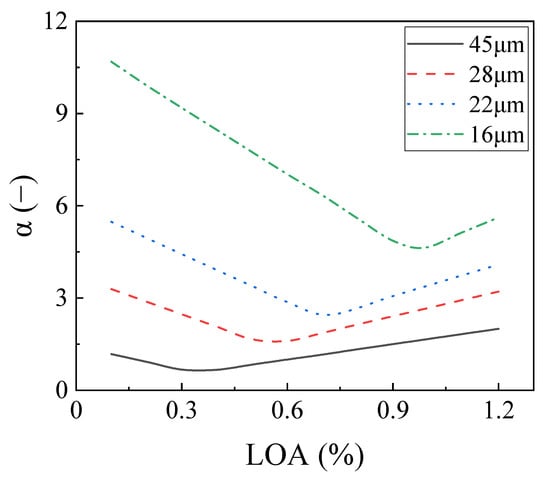 The dimensionless parameter α between fine particles as a function of the loading ratio of additives for four different sizes of fine powders are plotted in Figure 13 under fixed additive size (16 nm) with fixed effective surface area coefficient (0.1). It can be observed that the optimum additive loading ratios (corresponding to the minimum dimensionless force) are not the same anymore when the host powder particle sizes are different. A larger host particle has a lower optimum additive loading ratio and vice versa. For example, the optimum additive loading ratios are 0.4%, 0.5%, 0.7% and 1% for host particles that have particle sizes of 45, 28, 22 and 16 μm, respectively.