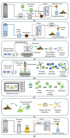 Simplified representation of the most used green extraction procedures, (a) supercritical fluid extraction, (b) subcritical water extraction, (c) pulsed electric fields, (d) ultrasound-assisted extraction, (e) microwave-assisted extraction, (f) enzyme-assisted extraction, and (g) pressurized liquid extraction.