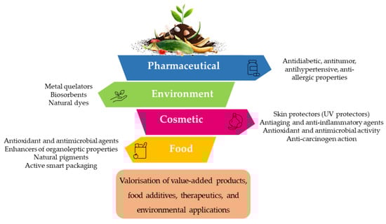 Agri-food wastes are highly biodegradable and comprise an important source of bioactive compounds, antibiotics, and pigments, which can be easily managed via their valorisation to value-added products, food additives, therapeutics, or other environmental applications [89,100]. These residues are also important subtracts for phytochemicals including phenolics, carotenoids and tocopherols, which provide antioxidant, therapeutic, and nutritional properties, of great interest to produce functional foods and drugs against acute and chronic diseases [119]. Hence, agri-food wastes represent a promising opportunity for the food, pharmaceutical and cosmetic sectors (Figure 4) [154].