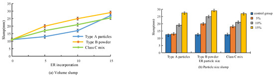 In Equation (11), is the enrichment factor and is the value of the strength class. ER concrete is used in urban construction cases where the compressive strength is greater, such as roads and floors. The final sand rate of ER concrete is determined after the concrete water consumption is set at a lower slump, as shown in Equation (12).