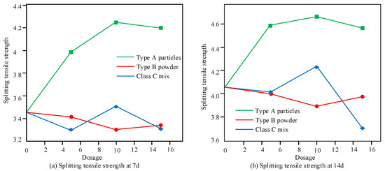 In Equation (16), is the strength test value, is the breaking load, and is the compressive area of ER concrete. To test the splitting tensile strength, the formula is shown in Equation (17).