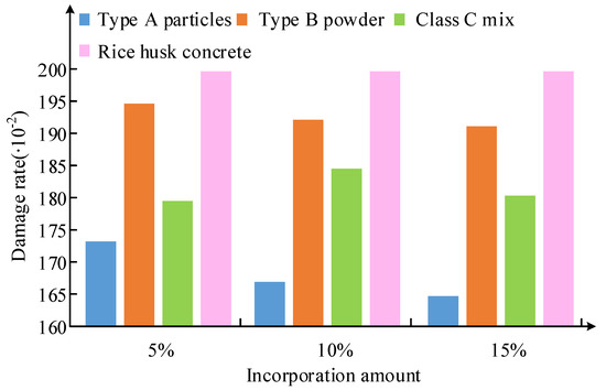 Figure 4 depicts the fatigue damage rate of three types of ER concrete and a rice husk concrete with varying mixing amounts during the following year. Among the three types of ER concrete with a 5% mixing ratio, the fatigue damage rate of the class A granular concrete is the lowest. The fatigue damage rate of the class B powdered concrete reaches 190–195 when the mixing quantity exceeds 10 percent. When the mixing ratio reaches 15%, the damage rate of all three types of ER concrete lowers and falls below 190. When the driving force is frequently applied, the fatigue cracking degree of the three ER concretes is smaller, and there will be no substantial permanent deformation. In comparison to prior trials, the fatigue damage rate of the three ER concretes is less than 170 when 10% A-type particles are introduced.