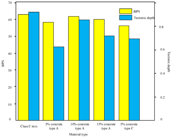 Figure 5 demonstrates the BPN values and construction depth of regular concrete with class A particles at 5–15% admixture and class C mixed concrete at 5% admixture in ER concrete. It can be observed that when epoxy plastic is combined with concrete, the BPN values and construction depth decrease significantly, but still fulfil the specifications. The BPN and construction depth criteria may be adequately met when class A concrete is mixed at a proportion of 10%. At a powder mixture of between 15% and 5%, both the construction depth and the BPN drop. At 15%, the epoxy plastic completely saturates and fills the spaces in regular concrete. Consequently, some bonding materials overflew and filled the surface air, resulting in a minor decrease in slip resistance. Following this, an increase in admixture will further diminish slip resistance and building depth. Therefore, a 10% class A granular concrete additive is the optimal choice for ER concrete.