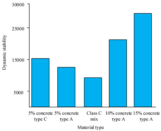 Figure 6 compares the dynamic stability of 5–15% class A granular concrete and 5% class C powder concrete with that of conventional concrete. The range of dynamic stability of the concrete is less than 3000. Thus, the cured epoxy plastic granules have a high modulus of elasticity and a greater capacity for deformation. It also meets the requirements for road paving and road rehabilitation in terms of high-temperature stability. Additionally, epoxy plastic granules can be used as an alternative to conventional concrete.