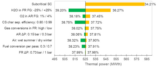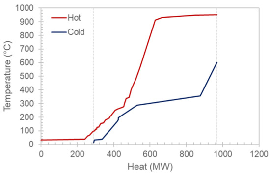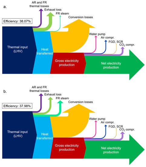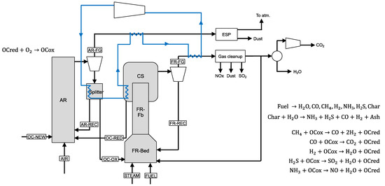The air injection flow rate into the AR is calculated by the model based on a given O2 residual concentration at the outlet of the AR (a molar fraction of 0.2 is used in Section 4). As mentioned above, the fuel inlet flow rate in the FR is set by the plant’s expected power and the fuel’s lower heating value. The flow rate of steam into the FR is set to achieve full gasification of the char based on the stoichiometry described in Figure 2. As part of the heat integration effort described in Section 3.4, the steam is produced by heat extraction from the AR flue gas.