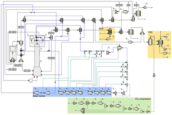 It is important to emphasize that within this global modeling approach, the model of the FR (general modeling principles, reaction paths, conversions, etc.) is based on results presented in previous works [24,25,26] and in the literature [15,16,30]. Regarding the other unit operations (flue gas cleanup units, steam cycle, etc.), the model is mainly based on the literature.