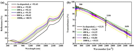 Variations in optical performance of the coatings after high-temperature aging: (a) Reflection spectrogram of high-temperature durability of the coatings; (b) Thermal transmission spectral changes of high-temperature durability of the coatings.