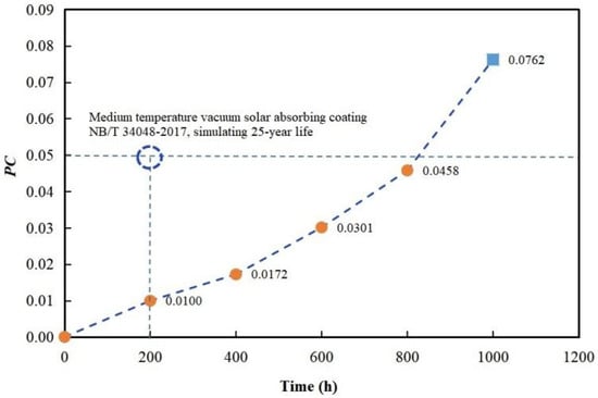 The ideal SSACs [] has high solar absorptance (α > 90%) while maintaining low thermal emittance (ε < 20%) at working temperature. By Chinese energy industry standard “Durability Specification for Absorber of Flat Plate Solar Collect” (NB/T 34072-2018), weatherability of SSACs is rated as PC ≤ 0.05 by the following definition: