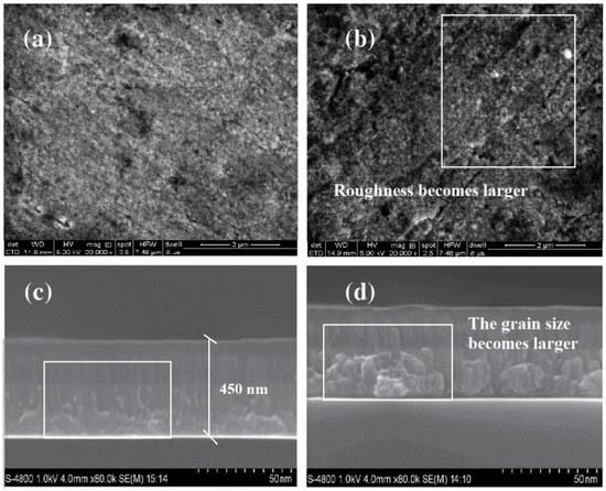 Figure 3 is a set of surface and cross-section SEM graphs of the coatings before and after high-temperature (500 °C) aging for 1000 h. Clearly, Figure 3a,c display the coatings in the initial state consist of regular arrangement of columnar grains with a diameter of about 5 nm. The grains were generally smooth and neat, and the coating thickness was about 450 nm. The grain compactness was gradually tightened along the substrate towards the coating surface. However, the grain interfaces are loosely aligned in some regions, which could cause certain defects in the coatings surface. Combined with Figure 1, the emission spectrum trend and the Fe-O and Fe-O-H of the transmission spectra are basically unchanged, indicating that the coatings compositions have changed slightly, while the change in optical performance has been caused mainly by the coatings surface morphology change. Figure 3b,d display the grain growth on the surface after high-temperature accelerated aging. A stress has been engendered around large-sized grains, breaking the original alignment of grains. Grain alignment has been disordered in different patterns, leading to coatings surface morphology reconstruction, which is another reason for the great variation of thermal emittance of the coatings. The coatings surface morphology reconstruction may also be ascribed to the disparity between the coefficients of thermal expansion of the stainless steel base material and the coatings, such that the coatings surface defects have given rise to cracks. After thermal treatment for a long time at high-temperature condition, oxygen would reach the surface of the matrix through cracks, thereby oxidating the substrate and generating an oxide layer, leading emissivity to further increase. Comparison of Figure 3c,d, it can be found that the substrate grain size and arrangement did not change, indicating that the stainless steel substrate resistance to oxidation. At the same time, the phenomenon of coatings grain growth, only in the area close to the substrate, the coatings surface grain size does not change much. We speculate that the surface morphology reconstruction was not strong. The surface morphology reconstruction, which increases the coatings thermal emittance, but also increases the optical trap depth and improves the solar absorbance. Finally, the coating-substrate interface does not change significantly and exhibits a high coating bond.