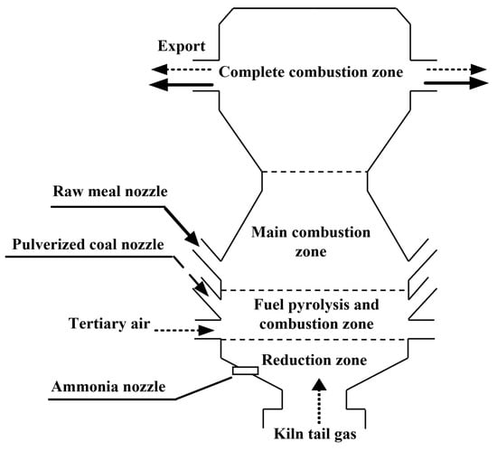 Precalciner is a crucial component of new dry cement precalcining technology. Important reactions such as pulverized coal combustion, carbonate decomposition, and nitrogen oxide reduction occur inside it. The precalciner has the advantages of improving the cement decomposition rate, reducing the heat load of the rotary kiln, and reducing kiln size and large-scale production. As shown in Figure 2, when the precalciner is working, its internal space can be divided into four areas: reduction area, fuel cracking and combustion area, main combustion area, and complete combustion area. The reduction zone is mainly used to reduce NOx in the exhaust gas of the kiln tail. The pulverized coal reacts with the high-temperature oxygen-enriched tertiary air in the fuel cracking and combustion zone. The coke is continuously cracked and burned, generating a lot of heat. The reaction generated in the main combustion zone is then transferred to the reduction zone. The raw meal and pulverized coal are uniformly mixed and burned. The raw meal is heat-absorbing and classified in this part, and its optimum temperature is 950–1000 °C. The function of the complete combustion zone is to complete the combustion of a small part of the unburned fuel and promote the raw meal. As the outlet of the precalciner, its maximum temperature should be maintained between 890 and 900 °C, so that the decomposition efficiency of the raw meal can be maintained above 90%.