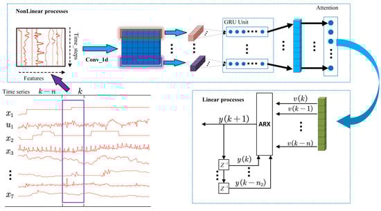 The CNN-GRU-Attention-ARX (CGA-ARX) consists of a CNN-GRU-Attention deep learning network that represents the nonlinear part and an ARX mode that represents the dynamic linear part, the specific structure of which is shown in Figure 4.