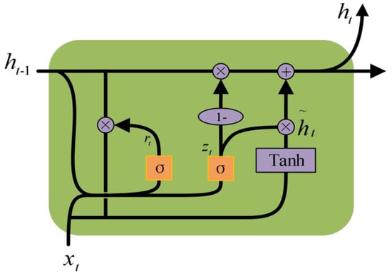 The GRU network is a variation of the LSTM network and performs better in processing time series than traditional recurrent neural networks [36]. The GRU unit is illustrated in Figure 5. A gated cyclic unit includes an update gate and a reset gate, which, owing to the design of the gates in the structure, allows the GRU network to capture the dynamics of the time series more effectively than traditional neural network features.
