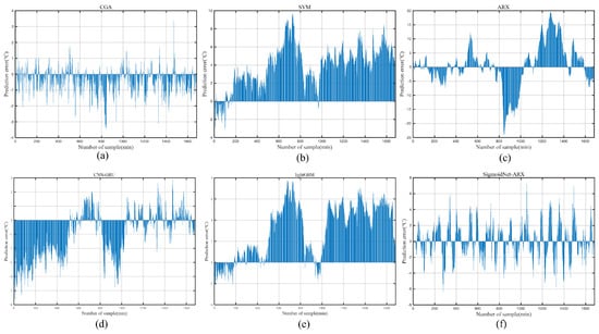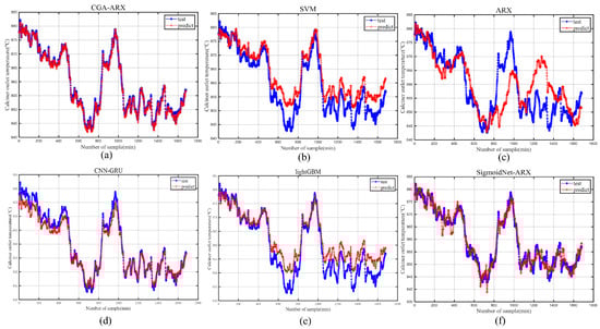 We extracted 10,000 sets of data from a 5000 t/d cement plant in Hebei Province, China, for March 2019 and processed the data. The final 25,000 sets of data were selected for training and 1680 sets of data for testing. The ARX model, sigmoid neural network Hammerstein model, CNN-GRU network, SVM, and lightGBM were also used for comparison, representing the traditional dynamic models, Hammerstein models, deep learning, and machine learning methods, respectively. Each model’s prediction results and errors are shown in Figure 7 and Figure 8.