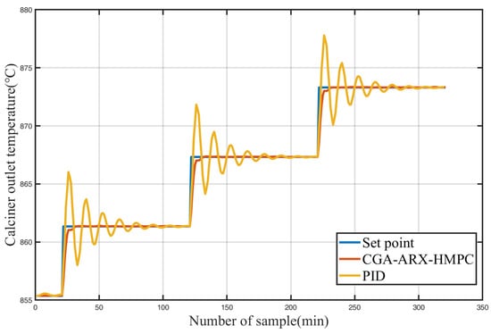 To demonstrate the superiority of the control system developed in this study, the operational data used for training the predictive model described above are introduced into the control system as a real-time operational state, and the PID method was tested for comparison. The results are shown in Figure 10. The CGA-ARX-HMPC control is significantly better than that of the PID controller. During dynamic changes, the CNN-ARX-HMPC performs faster and smoother in tracking the changing set point. However, the PID controller has large fluctuations during the dynamic process, with a large overshoot, and it takes longer to reach stable control.