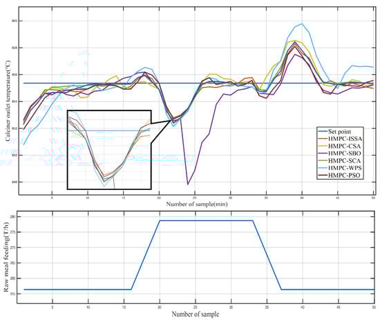 During the cement calcination process, the precalciner system experiences disturbances mainly from large variations in the feed rate. To evaluate the robustness of the control strategy proposed in this study, experiments on feed rate perturbations are designed, and the results are as follows: