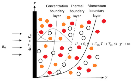 The significance of magnetic flux of nanoparticles discharge over an accelerating plate having a non-linear thermal radiative flux as shown in Figure 1. The thermodynamic effect of the fluid and the motion of the plate are both constant at a time t = 0. The temperature distribution and the volume fraction far from the surface of the plate are and , which are referred to as the ambient temperature and volume fraction. As the time , the fluid of the plate begins to accelerate and the temperature of the wall rises. A permeating homogeneous magnetic filled is applied to the fluid parallel to the y axis. The effects of an induced magnetic field in a fluid flow are ignored due to the tiny Reynolds number. The effects of a magnetic field that is produced in a fluid flow are negligible due to the low Reynolds number. When the Reynolds number is high, the effects of a magnetic field can be significant. Fluid flow is constrained at when the y coordinate is perpendicular to the plate. The variables y and time t influence the velocity U, temperature T, and concentration C.