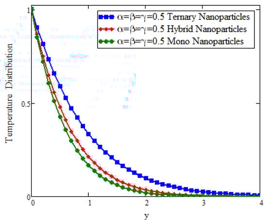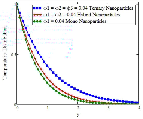 Comparison of temperature assessment across y as volume fraction when , t = 0.04, , and .