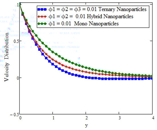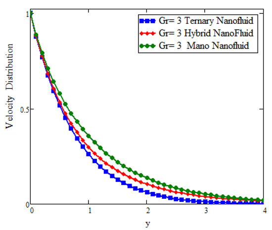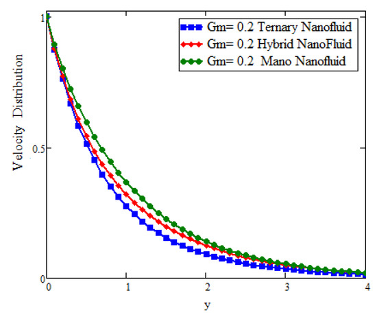This study deals with the application of Prabhakar fractional derivatives with different approaches to modeling with ternary nanoparticles. The Laplace transform method is used to obtain the analytical solutions. For different fixed constant values, some graphs are plotted to see the physical insights of a problem. Figure 2 presents the impact of fractional parameters on temperature. In this figure, the influence of fractional parameters can be seen in the solutions obtained with ternary, hybrid, and mono nanoparticles. It is found that, for the fixed values of fractional parameters, the solutions obtained with generalized laws are stronger and more accurate in exhibiting memory. As a result, the ternary model is a more powerful approach in improving the fluid properties than the hybrid or mono nanoparticle approaches. The behavior of the volumetric fraction in the temperature field is seen in Figure 3 by fixing all the parameters, such as the volumetric fraction parameters, to temperature. It is observed that the fluid temperature increases for ternary, hybrid, and mono nanoparticles, respectively, and in comparison the temperature of ternary nanoparticles is higher than others. Figure 4 presents the impact of Prandtl number on temperature. In this figure, the influence of the Prandtl number can be seen in the solutions obtained with ternary, hybrid, and mono nanoparticles. When is increased, the temperature drops. Physically, the minimum thickness of the thermal boundary layer is caused by thermal conductivity, which raises values and thickens of the fluid. Figure 5 presents the comparison of velocity with ternary, hybrid, and nanoparticles. In this Figure, the influence of the fraction parameter can be seen in the solutions obtained with ternary, hybrid, and mono nanoparticles. It is found that after fixing the fraction parameter, the solution obtained with the generalized law increases and becomes more accurate in exhibiting memory, and in comparison the velocity of ternary nanoparticle is smaller than the others. Figure 6 and Figure 7 show that after fixing the values of and , the fluid velocity increased for mono, hybrid, and ternary nanoparticles, respectively. and are the thermal and mass Grashof numbers, respectively. The Grashof number is the physical ratio of buoyancy forces due to spatial variation in fluid density (caused by temperature differences) to restraining forces due to fluid viscosity. The Grashof number illustrates how the buoyancy force is dominating, causing convection and increasing fluid velocity. A similar pattern was noticed for the mass Grashof number . Figure 8 shows the impact of volumetric fraction on the velocity profile. It can be observed that after fixing the value of volumetric fraction parameter for ternary, hybrid, and mono nanoparticles, the velocity decreases for ternary, hybrid, and mono nanoparticles, respectively. The behavior of ternary, hybrid, and mono nanoparticles in relation to the magnetic field parameter is shown in Figure 9. It is evident that the velocity of ternary, hybrid, and mono nanoparticles falls when the value of is fixed.