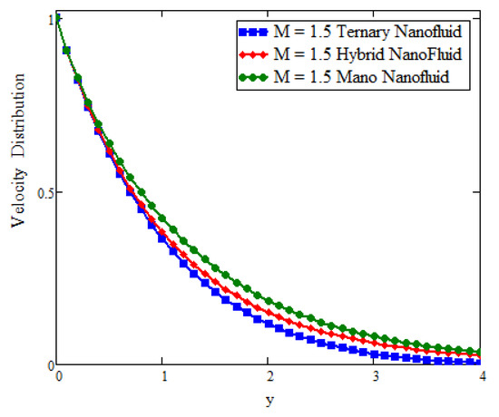 Comparison of velocity assessment with magnetic parameter across y as , , when t = 1, , , , , , and .