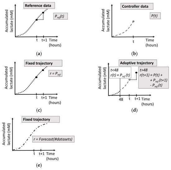 (a) Reference experimental data, (b) ongoing controller experimental data, (c) fixed target function, defined as the accumulated lactate values generated during one reference experiment, (d) adaptive target function, starting after 48 h, combining the measured accumulated lactate value of the ongoing controller experiment at time t together with the increase in accumulated lactate values of the reference experiment between time t and t + 1, (e) fixed target function, defined by a forecast of the accumulated lactate based on multiple previously gathered datasets.