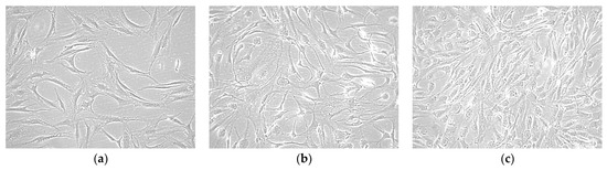Bright field microscopic images of the hPDCs cultured in tissue flasks (growing on the bottom of the tissue flasks): (a) low cell culture confluency one day after cell seeding, (b) medium cell culture confluency four days after cell seeding, (c) high cell culture confluency seven days after cell seeding.