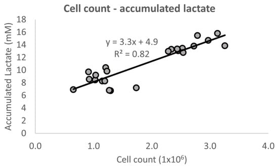 To assess the correlation between cell counts and accumulated lactate, all data points from the three different experiments were plotted in Figure 4. A significantly different value from zero trendline was fitted through the data with an R2 equal to 0.82.