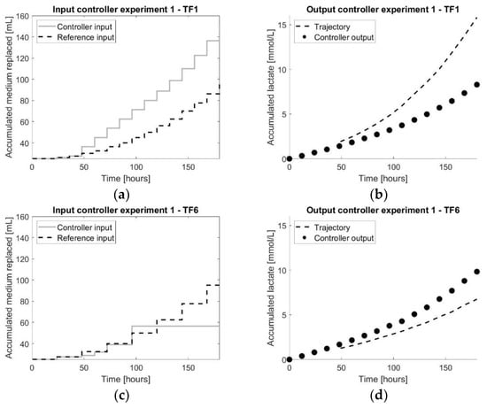 Before performing the controller experiments, the performance of the controller was evaluated using simulations. This means that the reference data generated from the initial experiment with a fixed predefined medium schedule were used simultaneously as the target function and as past input and output data. Starting after 48 h of initial data collection, the controller used the DARX model of the reference data as a prediction model to estimate the future control input that would generate a future output as close as possible to the target function. The simulation returned a set of control inputs estimated each time for one medium replacement in advance. In addition, the controller predicted the output that would occur after applying the suggested control input.