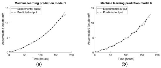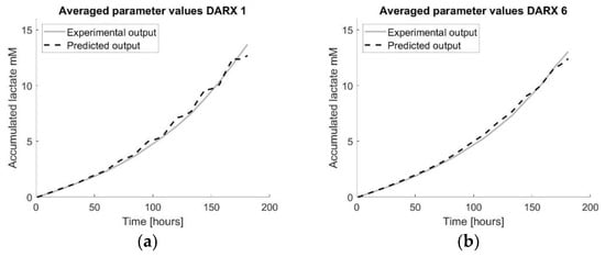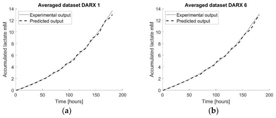 Visualisation of the forecast models using multiple datasets by applying a transfer function on the averaged dataset. The number in the title refers to the number of the tissue flask used as the test set. (a) visualizes the prediction model developed using the DARX transfer function model on the average of the whole training set with TF1 as the test set. (b) visualizes the prediction model developed using the DARX transfer function model on the average of the whole training set with TF6 as the test set.
