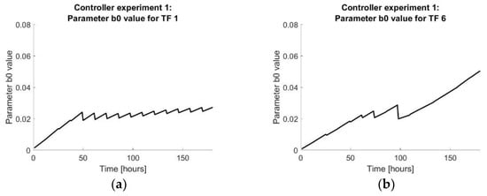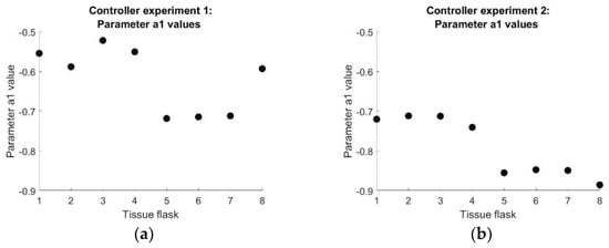 The steady state gain can be interpreted as the change of output (accumulated lactate produced) per unit change of input (amount of medium spent) and can be approximated by the value. To understand the effect of a change in the value, different cases during the controller experiments were observed. A different first order DARX transfer function was applied on each of the eight tissue flasks of both controller experiments. The fixed parameters of the resulting DARX model for all tissue flasks of both controller experiments are shown in Figure 11. The time-variant parameter of TF1 and TF6 of both controller experiments are shown in Figure 12.