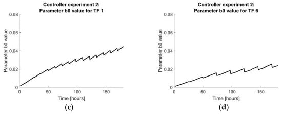 (a) The value over time of the resulting DARX model for tissue flasks 1 of controller experiment 1. (b) The value over time of the resulting DARX model for tissue flasks 6 of controller experiment 1. (c) The value over time of the resulting DARX model for tissue flasks 1 of controller experiment 2. (d) The value over time of the resulting DARX model for tissue flasks 6 of controller experiment 2.