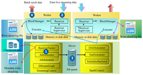 Spark Streaming for stream data processing can be roughly divided into four steps: starting the stream processing engine, receiving and storing stream data, processing stream data and outputting processing results. Its operation architecture is shown in Figure 1, initializing the streaming context object, instantiating the D Stream graph and job scheduler during the start-up of this object. The D Stream graph is used to store information such as D Streams and the dependencies between D Streams. Job scheduler includes receiver tracker and job generator. The receiver tracker is the manager of the driver-side stream data receiver, and the job generator is the batch job generator. During the start of the receiver tracker, the receiver supervisor in the corresponding executor is notified of the start of the stream data receiver according to the stream data receiver distribution policy, and then, the receiver supervisor starts the stream data receiver. The receiver is started, and it continuously receives real-time streaming data and makes a judgement based on the size of the data coming through. If the amount of data is small, multiple pieces of data are saved into one and then stored in blocks; if the amount of data is large, it is directly stored in blocks. Block storage is divided into two types depending on whether prewritten logging is set up: one type is to use the non-prewritten logging block manager-based block handler method to write directly to the worker’s memory or disk, and the other type is the write ahead log-based block handler method, which writes data to the worker’s memory or disk at the same time as prewriting the log. After the data are stored, the receiver supervisor reports the meta-information about the data storage to the receiver tracker, which then forwards this information to the receiver block tracker. The receiver block tracker is responsible for managing the meta-information about the received data blocks. A timer is maintained in streaming context’s job generator, which performs the job generation operation when the batch time arrives. As the data from the live stream continue to flow in, the Spark framework keeps processing the data and outputting the results accordingly.