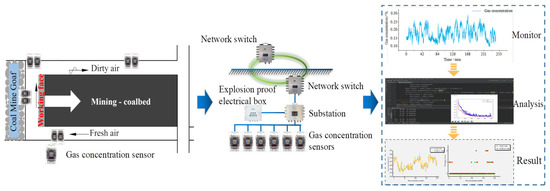 Coal occupies a very important position in China’s energy structure, and safety is a necessary prerequisite for coal mining to ensure the economic efficiency of coal mines and the health of underground workers [1,2,3,4,5]. With the development of intelligent coal mines, accurate and efficient data mining has become an inevitable prerequisite for intelligent analysis and decision making, including the analysis and mining of gas concentration data. In recent years, as coal mining operations continue to expand much deeper, the underground operating environment has become increasingly complex, and gas hazards have become increasingly prominent [6,7,8,9]. At this stage, gas data monitoring technology has gradually matured, realising real-time online monitoring and real-time transmission and enabling online analysis and prediction based on various prediction models. A great deal of work has also been done in the field of gas prediction and early warning by domestic and international researchers through the use of algorithms, such as long short-term memory (LSTM), the autoregressive integrated moving average (ARIMA) model and support vector machines (SVMs) for gas concentration prediction [10,11,12,13,14]. An LSTM recurrent neural network prediction method is proposed for a gas concentration prediction analysis with prediction errors of 0.0005–0.04, demonstrating the applicability of the model for gas concentration prediction [15]. A combination of the autoregressive moving average (ARMA) model, the chaos time series (CHAOS) model, the ED model (single-sensor) and the ED model (multisensor) is proposed, which can predict gas concentrations at five different time steps with few errors, further improving the prediction accuracy [16]. A gated recursive unit (GRU)-based mine gas concentration prediction model is proposed, which can make full use of the time series characteristics of mine gas concentration data, and the prediction results have less errors and high practical value [17]. The random forest, extreme random regression tree and gradient boosted decision tree (selected GBDT) regression algorithms are used as base learning devices, and the output of each base learner is used as input using a superposition algorithm to train a new model for predicting gas concentrations. The results show that the superposition model had high prediction accuracy [18]. A self-recurrent wavelet neural network (SRWNN) based on interval prediction rather than point prediction is proposed as a prediction model, which is applicable to the gas concentration prediction system of large-scale intelligent edge devices and is better for gas concentration prediction analysis [19].