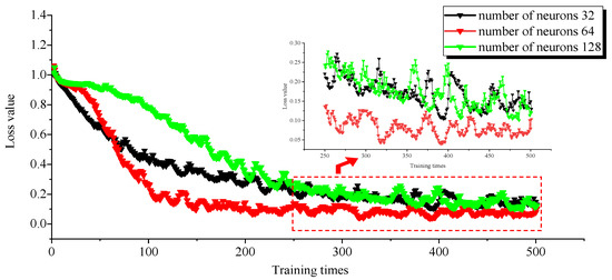 The number of neurons in the hidden layer leads to underfitting if there are too few, and too many neurons also leads to poor training results. Thus, in this paper, we set the number of neurons in the range of 32~128. Through extensive experiments, it was found that the training effect is relatively good when the number of neurons is 32, 64 and 128. To further determine the number of neurons, the loss values were compared for 32, 64 and 128 neurons. The process of optimising the number of neurons and the training error is shown in Figure 5 and Table 2.