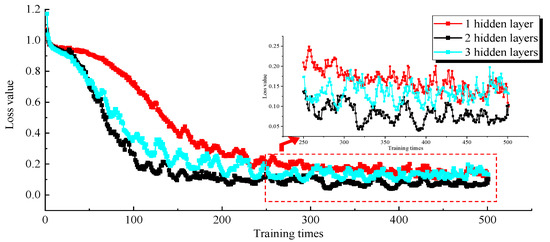 For general datasets, 1~2 hidden layers are sufficient, but for complex datasets involving time series and computer vision, additional layers are needed. The dataset studied in this paper has strong time series characteristics, so the range of hidden layers is set to 1~3 for the comparative analysis, comparing the training effects of different hidden layers and comparing the change process of loss values under 1, 2 and 3 hidden layers. The process of optimising the number of hidden layers and the training errors is shown in Figure 6 and Table 3.