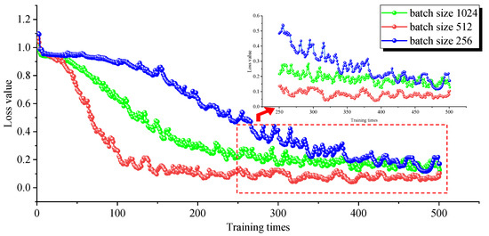 As seen in Figure 7 above, the trends of the loss value curves for the three different batch sizes are obviously different. When the batch size is 256, the loss value decreases slowly, the loss value fluctuates severely throughout the training process and, finally, the loss value converges to 0.2. When the batch size is 1024, the loss value decreases quickly, fluctuates more smoothly and, finally, converges to 0.2 at the 350th time. When the batch size is 512, the loss value decreases quickly, the training process is more stable and the training effect is the best. The MAE and RMSE of the model were the smallest, and R2 was the largest for batch size 512 in Table 4, which was the best overall performance.