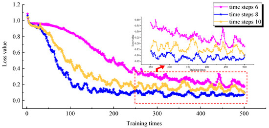 As seen in Figure 8, when the time step is 6, the loss value decreases slowly and fluctuates considerably as the loss value tends to stabilise. When the step size is 10, the training becomes faster, but the loss values fluctuate severely throughout the training process. The best training result was achieved when the step size was 8, with the loss value falling fast and fluctuating smoothly and finally converging to 0.2 at the 350th time. Additionally, combined with the fact that the MAE and RMSE of the model were the smallest and R2 was the largest at the time step size of 8 in Table 5, it was determined that the time step size was 8.