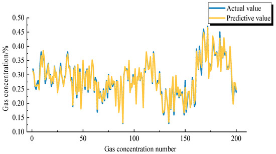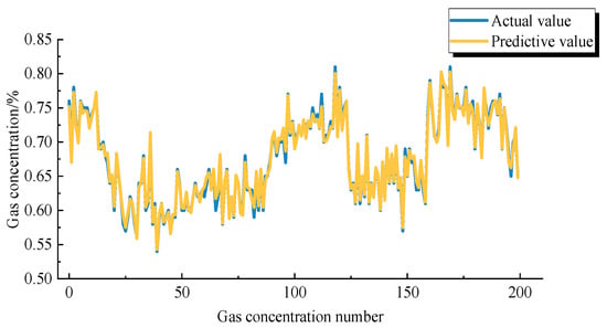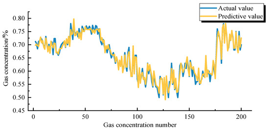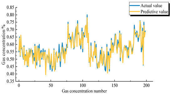 According to the above study, the optimal parameters of PSO-GRU are obtained. The number of neurons in the hidden layer is 64, the hidden layer is 2, the batch size is 512 and the time step is 8. According to the specific optimised parameters determined above, the training and prediction of the gas concentration data of the working face are carried out, and Figure 9 is obtained. The prediction results based on the PSO-GRU model have a better fit with the real values, the iteration speed during the training process is faster and the prediction accuracy is considerably improved, which shows that the model has strong applicability in the process of gas concentration prediction.