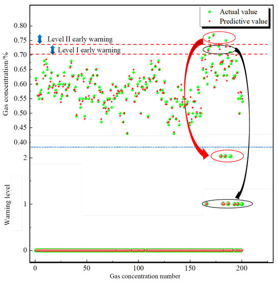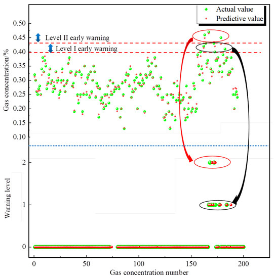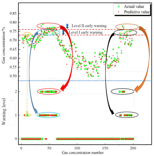 To verify the usefulness and efficiency of the SSF, the upper corner gas data, return airflow gas data and inlet airflow gas data were imported into the SSF for verification. Error comparisons were carried out using three evaluation metrics (MAE, RMSE and R2) for the upper corner, return airflow and inlet airflow gas data. The early warning model was analysed using prediction accuracy. Early warning levels were calculated for the gas concentrations in the upper corner, inlet airflow and return airflow according to the determination method of the gas warning rules in Section 3.3, and the warning ranges were obtained as shown in Table 6. The upper corner, inlet airflow and return airflow gas concentration prediction and warning diagrams are shown in Figure 11, Figure 12, Figure 13, Figure 14, Figure 15 and Figure 16.