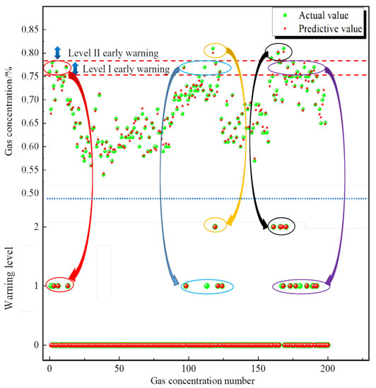 As seen in the gas prediction graph, the PSO-GRU model has a good prediction, with a model fit of 0.974, which can be used for early warning of gas concentrations. As shown in Figure 10, the gas concentration remains normal without major fluctuations until the 35th sample point. From the 35th sample n point to the 60th sample point, the predicted gas concentration continues to be high, with warning level I and warning level II occurring. From the 60th to the 170th sample point, the gas concentration decreases and then rises again at the last 20 sample points to warning level II. Based on the comparison between the measured and predicted values, the warning situation is generally consistent with the actual situation.