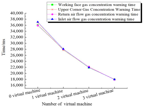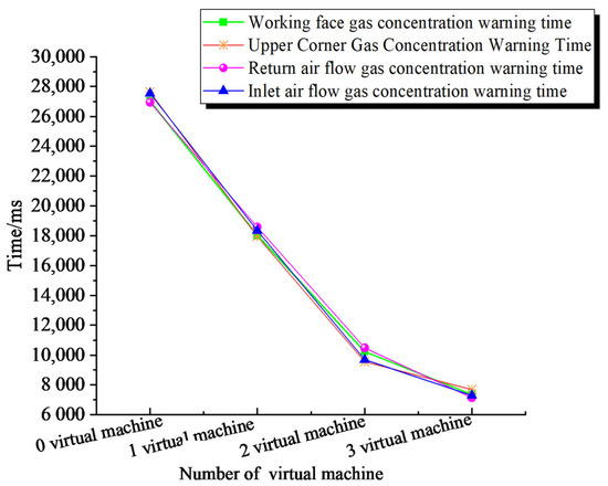 It can be seen from the prediction accuracy in different areas that the overall prediction accuracy of the model is high, all of which can exceed 90%. Table 9 shows that the warning accuracy for the two warning levels is 94.9% and 97.2%, respectively, which is a high warning accuracy rate. To further validate the advantages of the high running efficiency of the model proposed in this paper, a control variable approach was used to compare the running time of the model using the SSF (see Figure 18) and the model without the SSF (see Figure 19). Additionally, it can be seen that the overall running time of the model is shortened after the SSF is used. When using the same method to compare the run times with and without the virtual machine, it was found that the average warning time was longer when the model was run locally without the virtual machine, with a slow increase in warning speed when one virtual machine was turned on and faster when three virtual machines were turned on. It can be seen that the alert time based on the SSF is fast, which greatly improves the efficiency of the alert and effectively validates the SSF’s ability to process large volumes of data quickly and efficiently. Combining SSF with gas concentration monitoring enables accurate predictions and graded warnings of gas concentrations and support for mine management in decision making in the event of a sudden increase in gas concentration. This provides a guarantee for the safe production of coal mines.