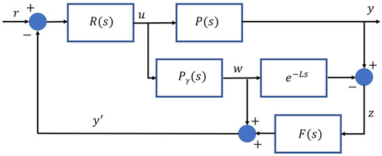 Assuming that model (1) is sufficiently reliable, when Equation (2) holds, the Smith Predictor can be used [37]. This PID-based predictive controller overcomes the limitations of a PID controller, which exploits only feedback. A Smith Predictor architecture is reported in Figure 1. In Figure 1, is the reference to be tracked, and are intermediate variables and is the feedback variable. The input-output transfer function related to is [37]
